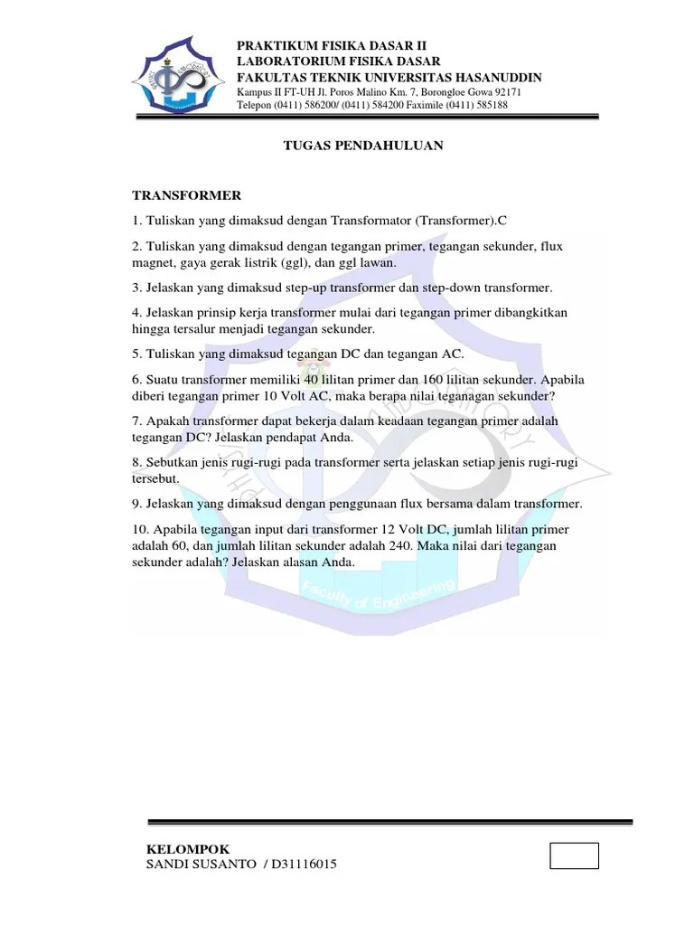 Turunkan bahwa dalam keadaan resonansi arus yang mengalir. Buktikan persamaan 2.3 dan 2.4. Bagaimana cara memasang dan menggunakan amperemeter dan voltmeter. Dalam matakuliah fisika dasar tersebut, pemberian teori ke mahasiswa juga dilengkapi dengan kegiatan praktikum di laboratorium fisika dasar. 15wp03102 ( 2 sks teori + 1 sks praktikum) ggl induksi dan induktansi dept.